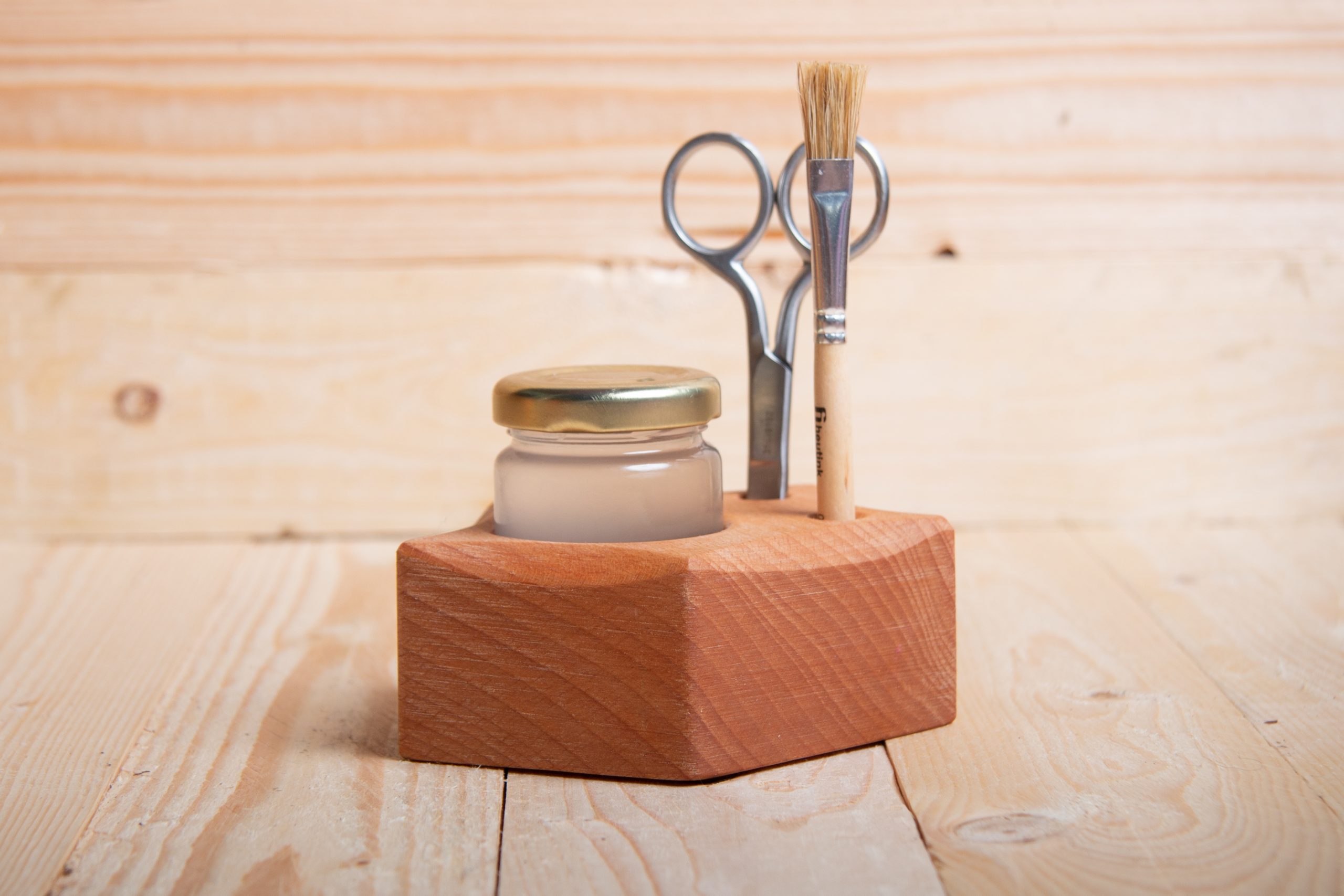 prachtige massief beuken houder met glazen potje ukkie lijm en houten lijmkwastje en optioneel een mooi metalen kinderschaartje